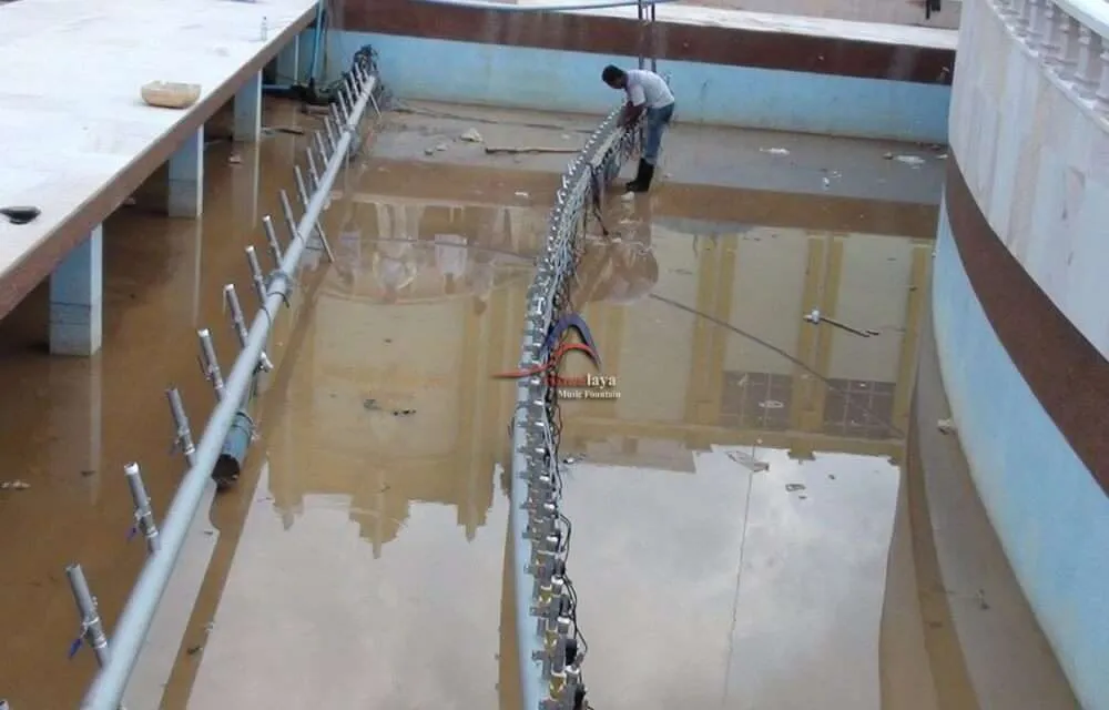The music fountain was installed in Cambodia in 2010 which is designed with an irregular shape, measuring 32 meters in length and 20 meters in width, and equipped with 228 nozzles,18 water pumps,358 fountain color lights,112 solenoid valves,8000 meters of cables, with a total starting power of 54.63 KW.