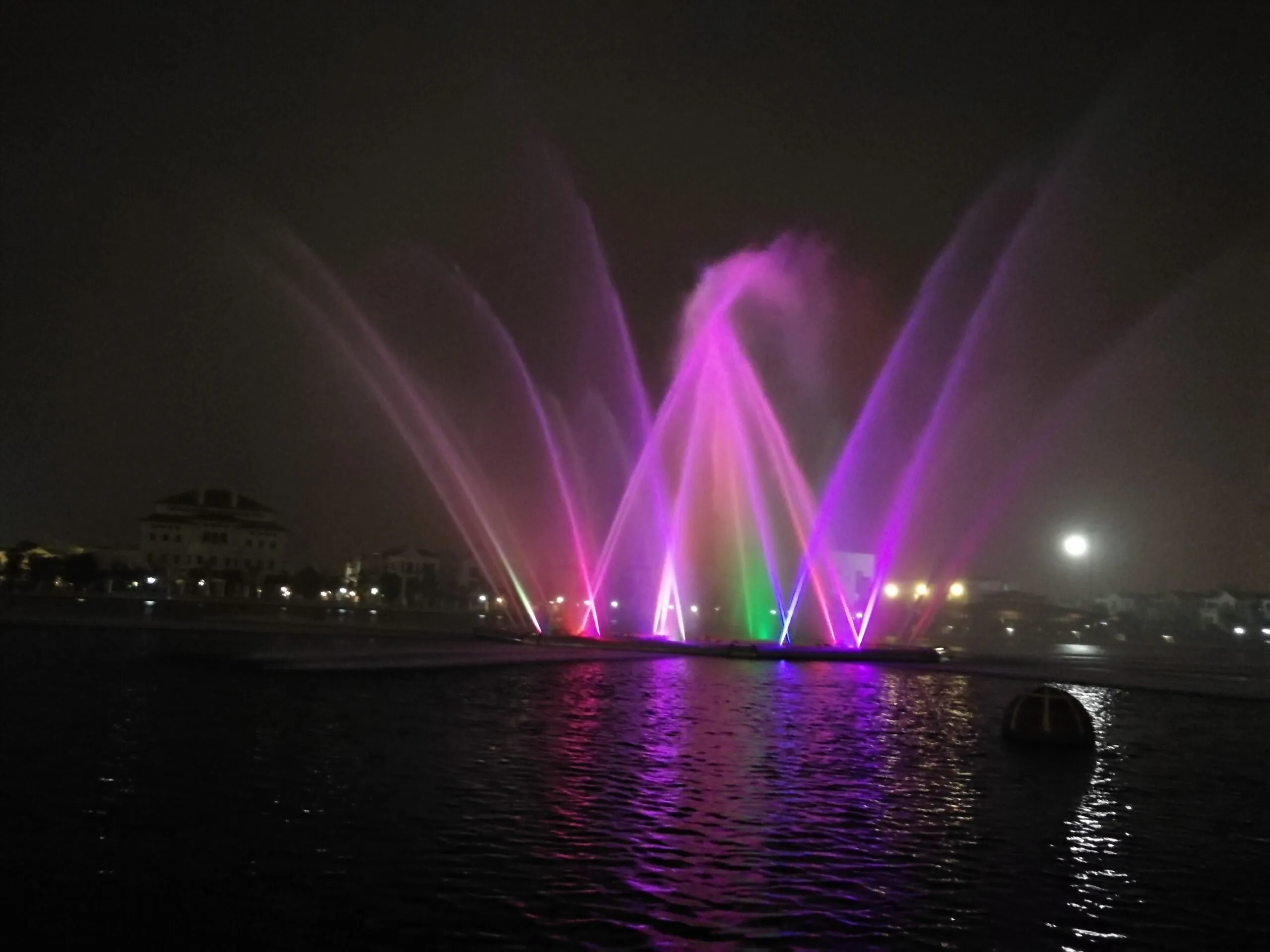 The Vietnam digital water dancing floating fountain in Ho Chi Minh City, a remarkable music fountain project, was designed and constructed by a renowned fountain manufacturer Himalaya Music Fountain Corporation. This fountain is based on an octagonal floating device, with 48 sets of one-dimensional fountain systems installed on it. Each one-dimensional fountain system is equipped with a specially designed one-dimensional nozzle and a separate water pump, capable of shooting water columns up to 30 meters high.