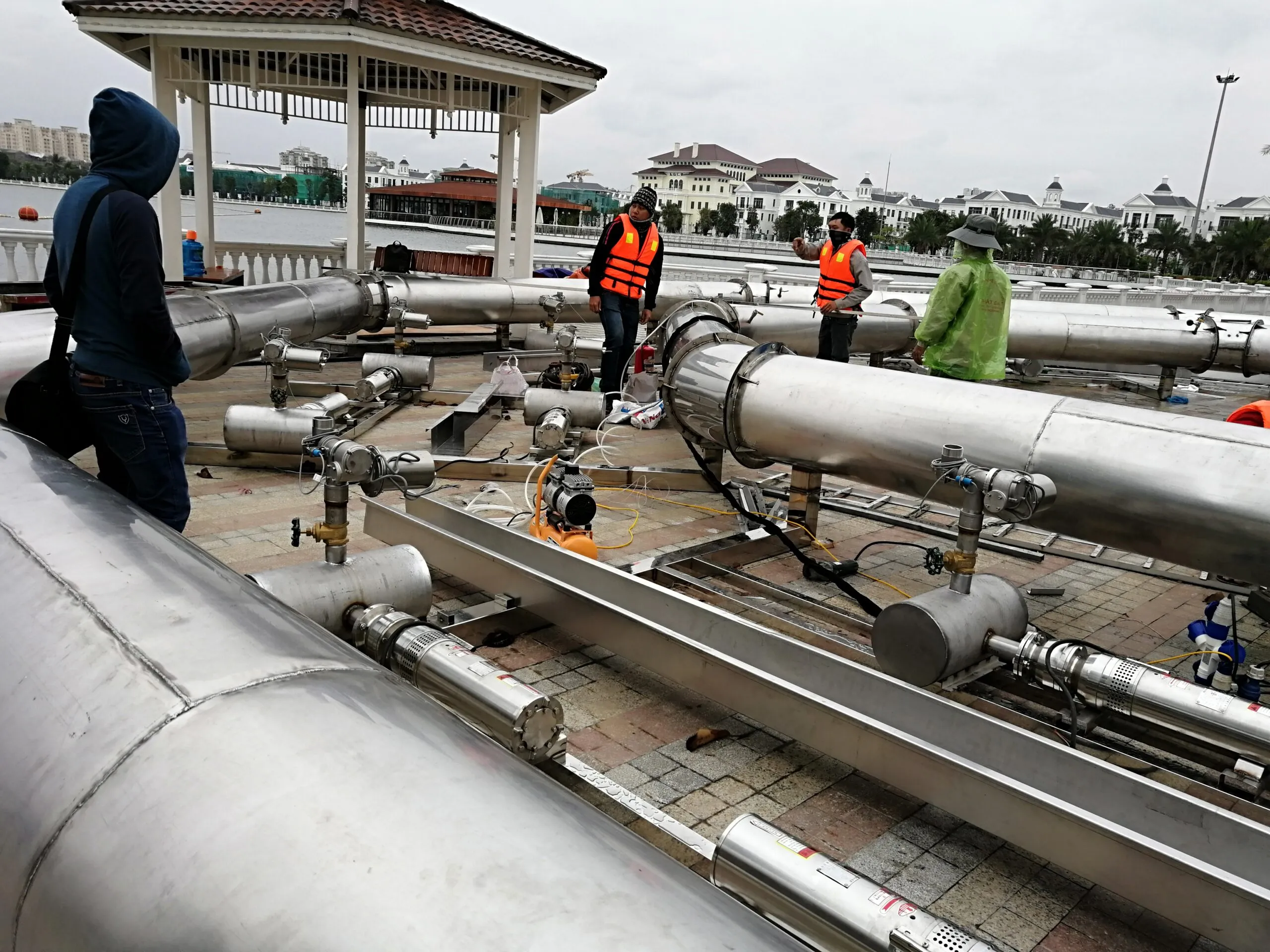 The meticulous programming of the Himalaya Music Fountain control software endows this fountain with unique dynamism. The 48 sets of one-dimensional fountains bloom like a lotus flower, gently opening under the command of the control software.This floating digital fountain installation was successfully completed at the end of 2018.