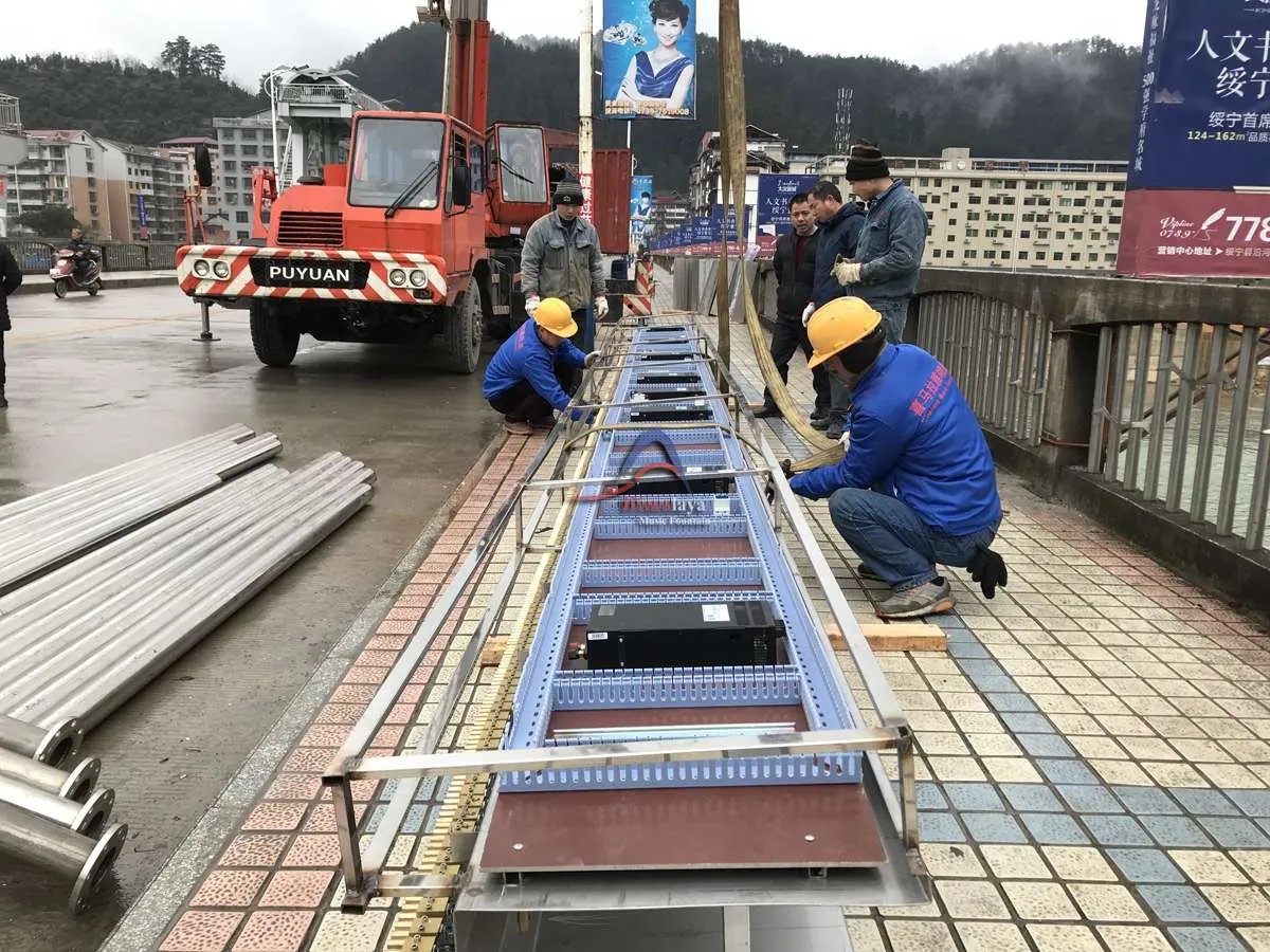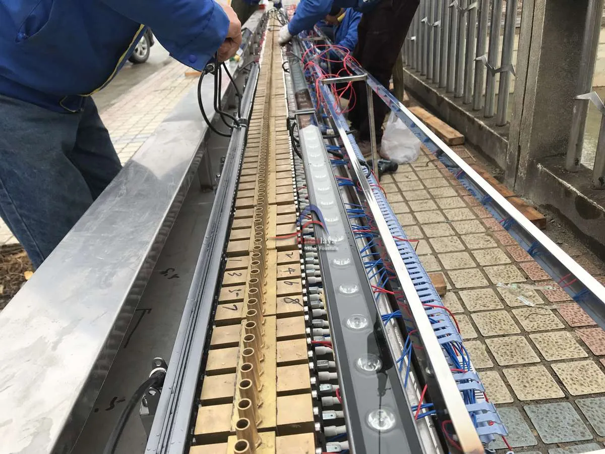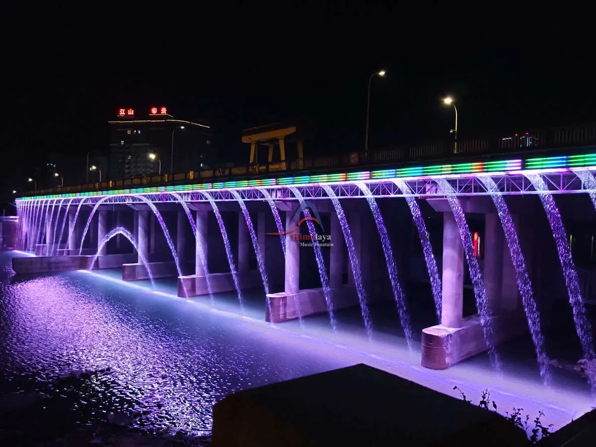 Designed and constructed by Himalaya Music Fountain (HMF), this CNC Digital Water Curtain Fountain is 135 meters long and 16 meters high, comprising 2800 nozzles, It is the longest digital water curtain bridge fountain of China. Himalaya Graphical Water is featured has got the fastest scanning speed in the whole world (1000 Scanning/Second).