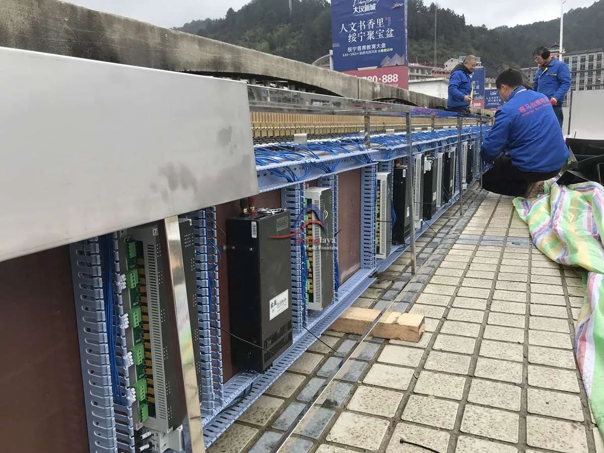 The CNC Water Curtain is a high-tech water feature product that employs innovative technology. It is a suspended water curtain (water screen, waterfall) capable of projecting various patterns and text, among other designs. This technology utilizes CNC valves to control the free-falling time difference of water columns, altering the length of water lines, thereby forming different patterns and text with the descending water lines. The three-dimensional water curtain can project any characters, instantly forming words and highlighting themes, infusing the scene with dynamic charm that captures attention from afar and entices visitors.